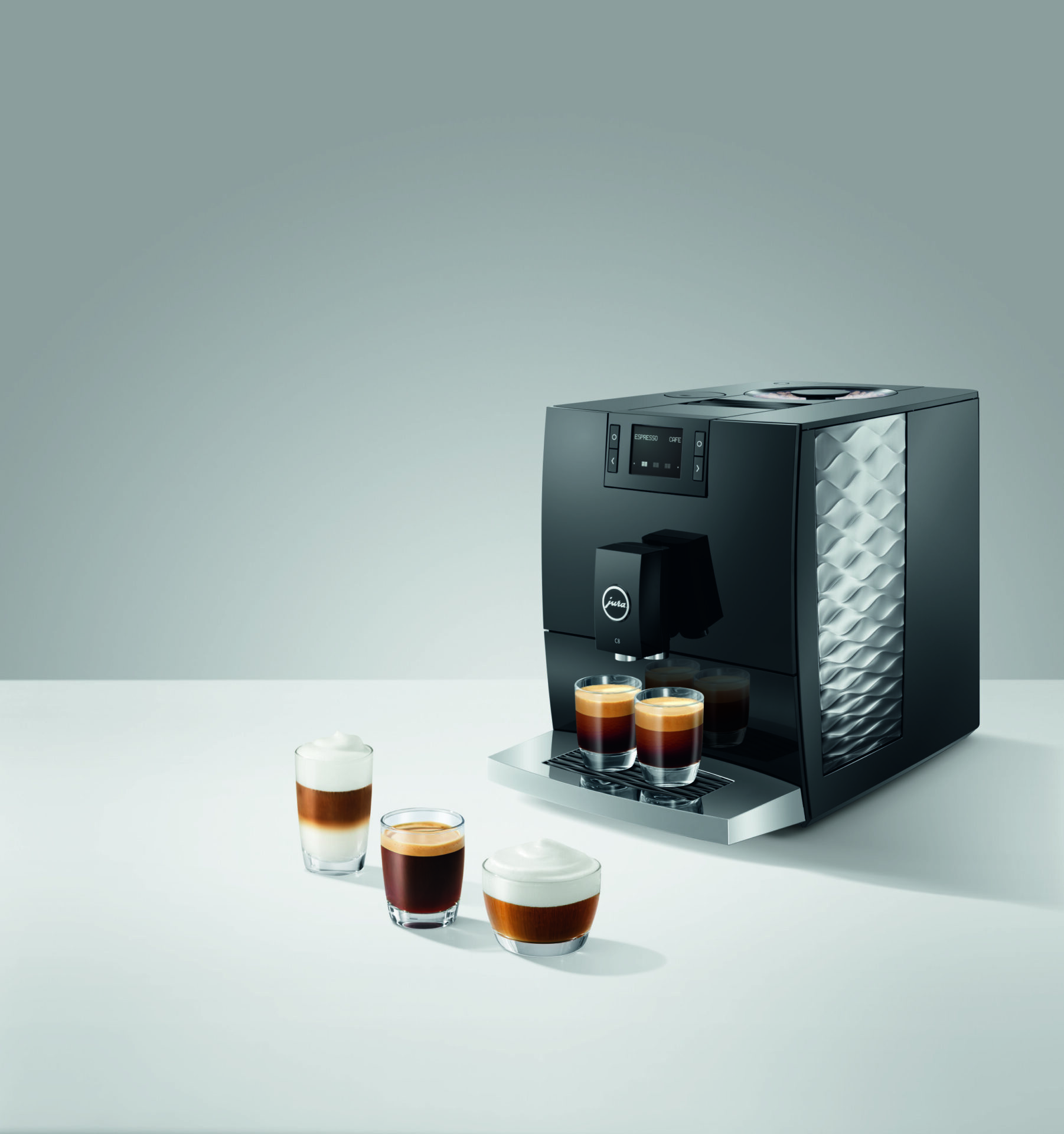 Imponujące wypukłe i wklęsłe linie ekspresu C8 wizualnie odzwierciedlają jego cechy charakterystyczne dla segmentu premium. Intuicyjny panel sterowania Easy Control oraz przyciski zapewniają prostą i wygodną obsługę. Wraz z Wi-Fi Connect i aplikacją J.O.E.®, C8 może być obsługiwany za pomocą smartfona lub tabletu i oferuje szereg dodatków, które przenoszą doświadczenie użytkownika na wyższy poziom.
